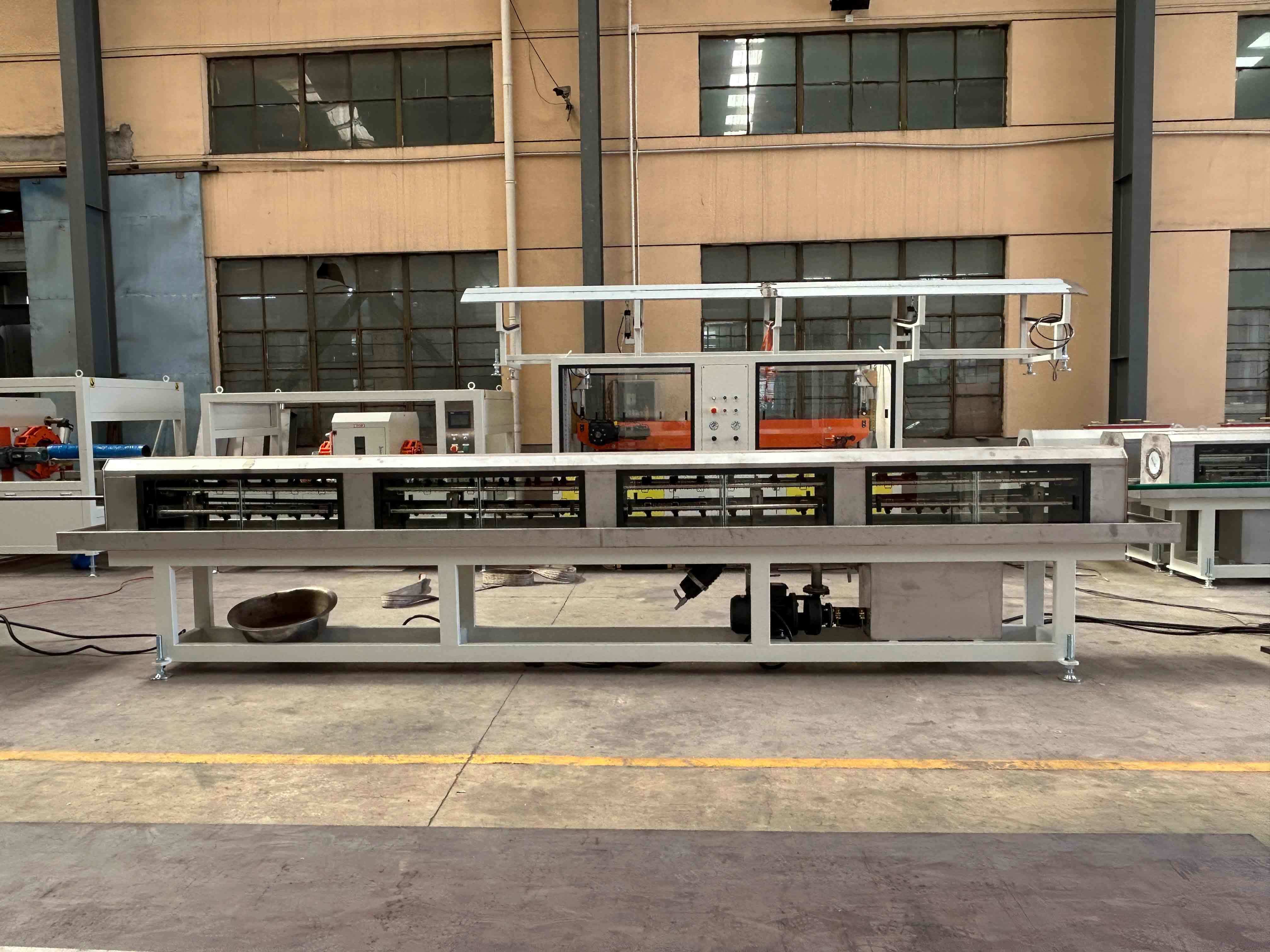 Stopiony plastik przechodzi przez głowicę formującą w celu uformowania rur/profili, a następnie wchodzi do zbiornika kalibracyjnego próżniowego w celu precyzyjnego wymiarowania i chłodzenia.
