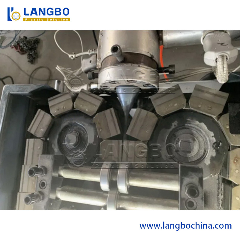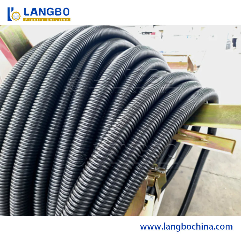 Granulki z tworzyw sztucznych są wprowadzane do zbiornika i rozpuszczane w wytłaczaniu pod kontrolowaną temperaturą i ciśnieniem.Materiał stopiony jest następnie kształtowany w formie falistej przez próżnię lub kształtowanie ciśnieniowePo ukształtowaniu rury faliste są schładzane wodą w celu stabilizacji ich kształtu.