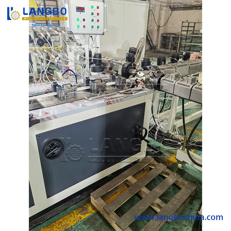 The process flow of this line is PVC powder + additive - mixing-material feeder-twin screw extruder- mould and calibrator-vacuum forming table-haul-off machine-cutting machine-discharge rack.